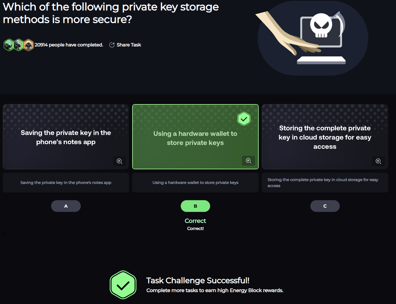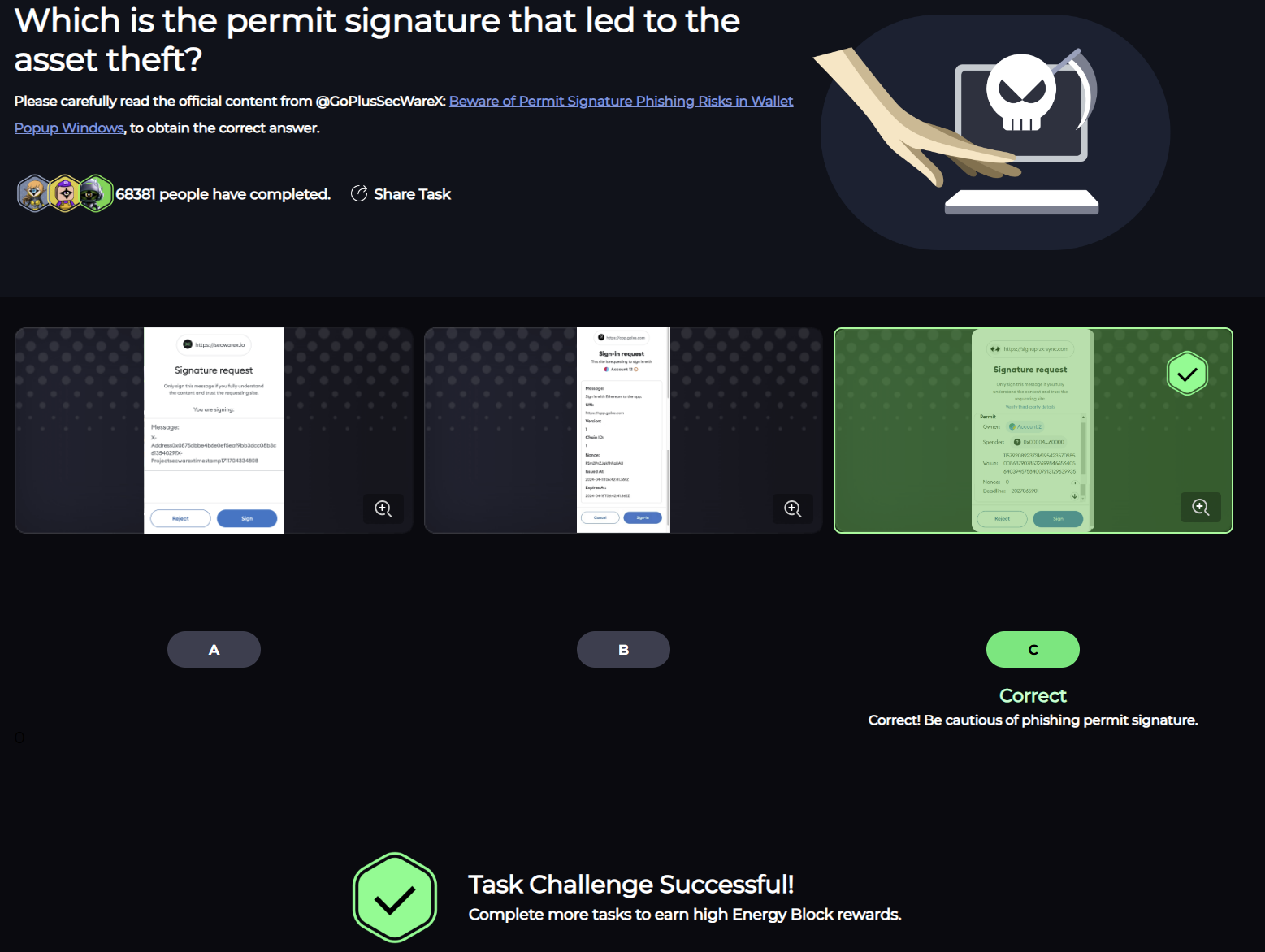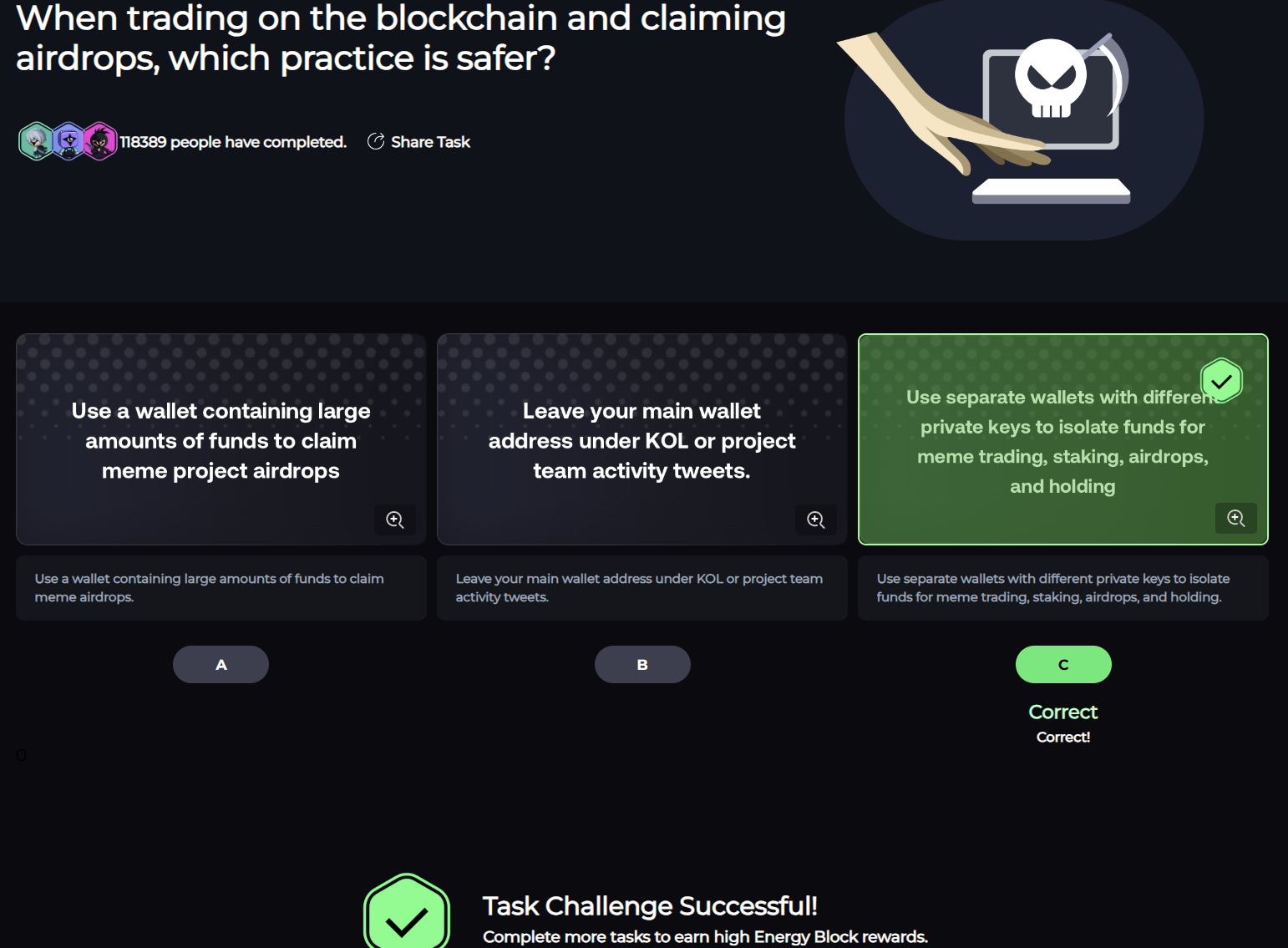 Emergency Security TasksMission Page URL: https://secwarex.io/task-detail/145?channelCode=BMX1NEQ6 SecWareX secwarex.io Q1. When trading on the blockchain and claiming airdrops, which practice is safer?A1. Use separate wallets with different private keys to isolate funds for meme trading, staking, airdrops, and holding. Q2. How can you effectively prevent phishing website scams?A2. Access and ..
